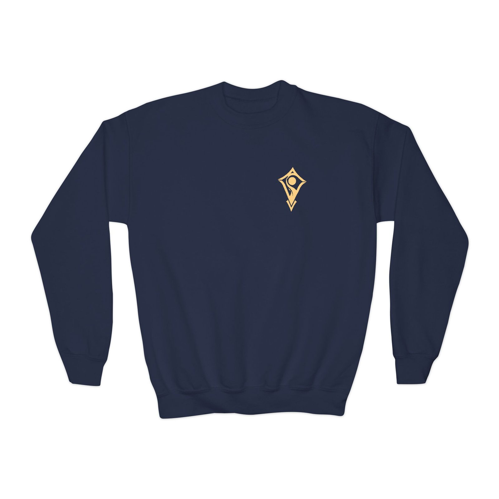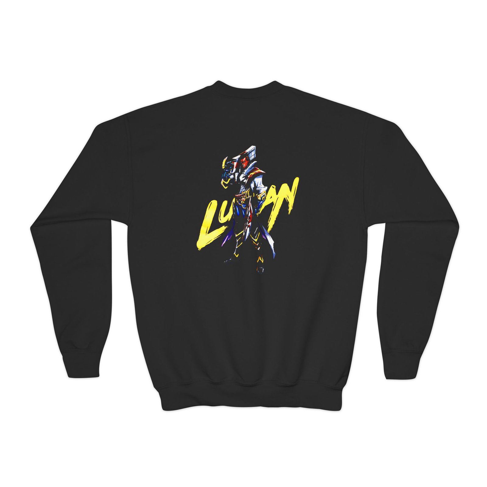 This loose-fit youth League Of Legends Sentinel of Light Lucian crewneck brings moody, occult-inspired style to everyday wear. A storm-lit silhouette and grainy, moonlit scene sit beneath hand-lettered gothic text in bruised purple — a look that reads like a midnight zine spread. The sweatshirt’s medium-heavy knit feels substantial without weighing down small frames, and the ribbed collar and cuffs hold their shape through play and repeat washes. Let this crew be the quiet centerpiece of a darker wardrobe: layered over band tees, hoodies, or under a denim jacket for a city-night vibe that leans mysterious and made-for-exploring.
