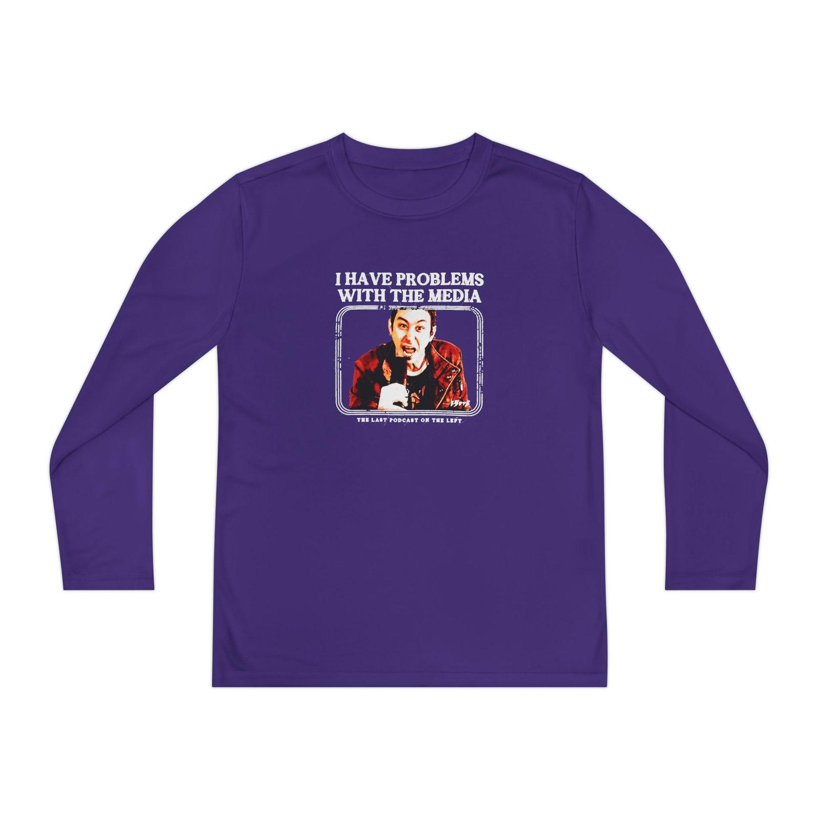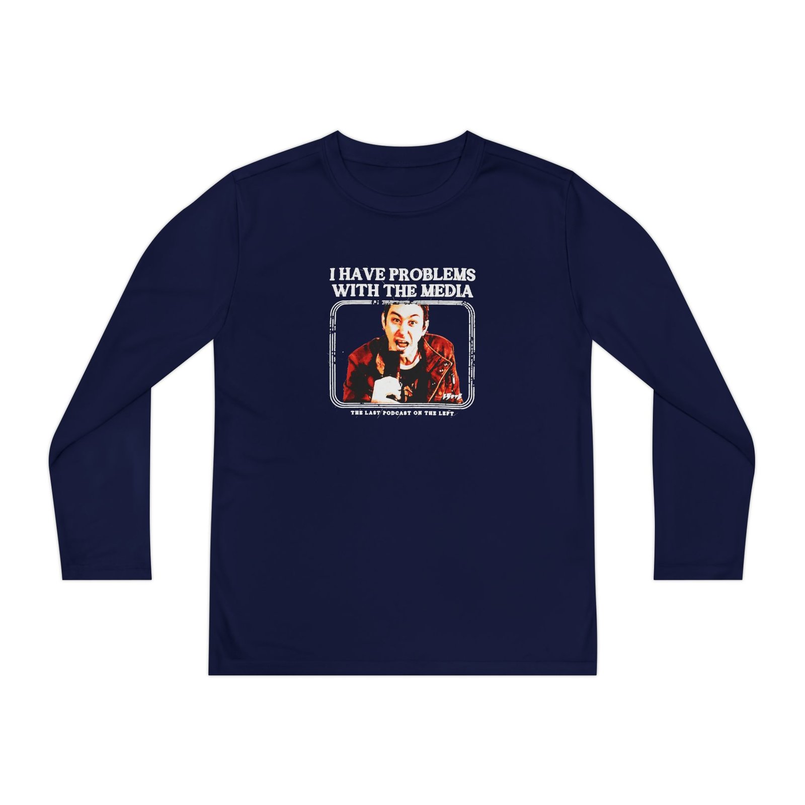 A lightweight LPOTL I Have Problems with the Media long-sleeve designed for active kids who lean into darker, atmospheric style. The shirt’s smooth, moisture-wicking polyester keeps movement unhindered and dries fast after practice or a day outside. The front art drops into a stormy, grayscale scene crowned by a jagged flash of lightning and moody gothic lettering — a bold, quietly rebellious statement that pairs with skate nights, band practice, or just hanging with friends. The athletic cut skims the body for an energetic silhouette, while the tear-away label keeps comfort high. Warmth is balanced with breathability, so it layers easily under a jacket or wears solo on cooler evenings.