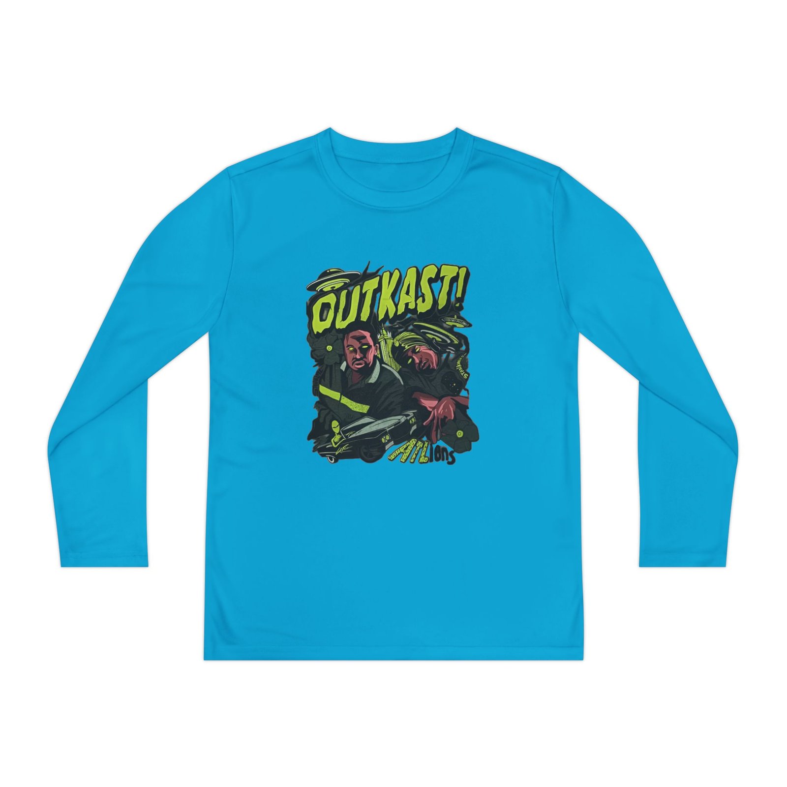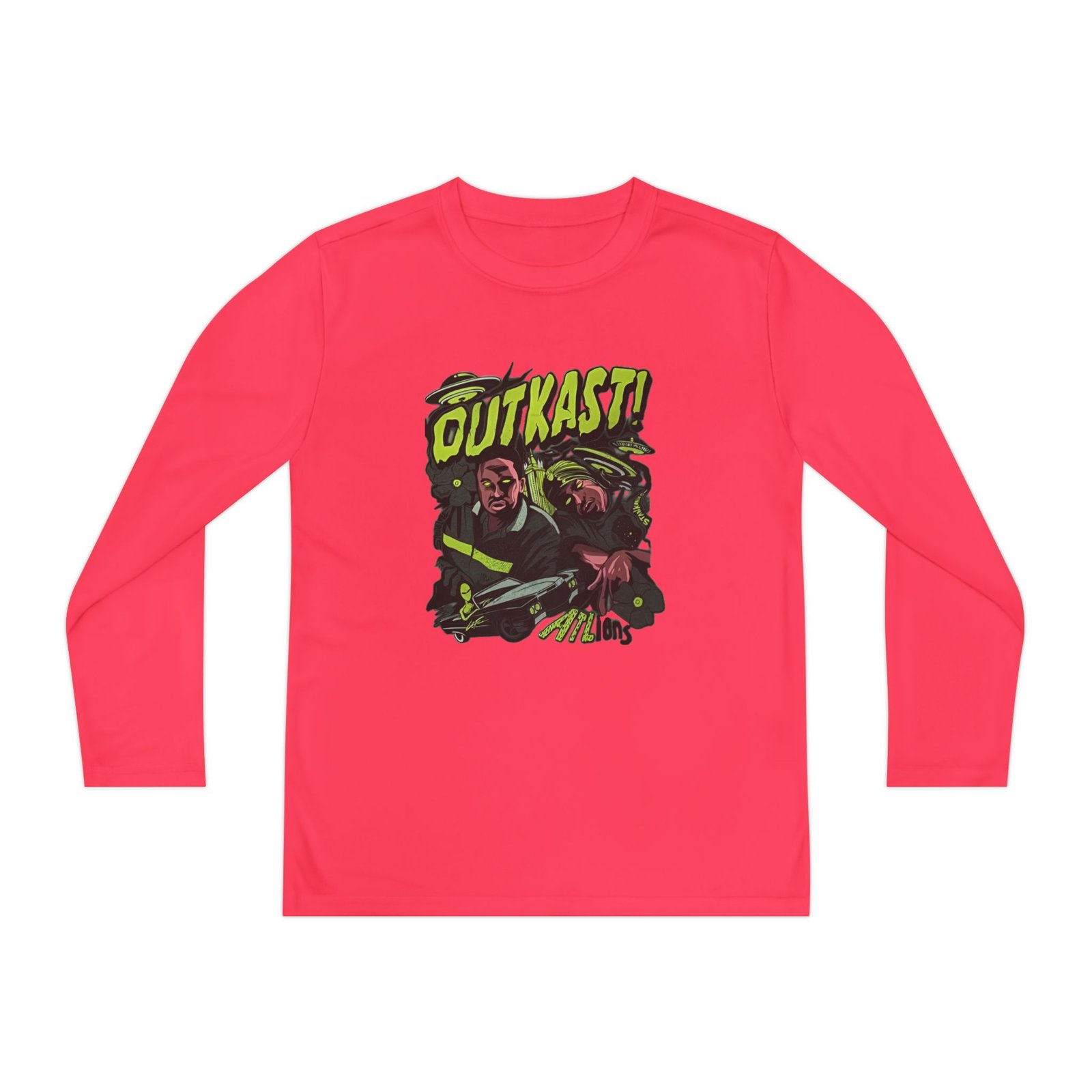 A lightweight Outkast long-sleeve designed for active kids who lean into darker, atmospheric style. The shirt’s smooth, moisture-wicking polyester keeps movement unhindered and dries fast after practice or a day outside. The front art drops into a stormy, grayscale scene crowned by a jagged flash of lightning and moody gothic lettering — a bold, quietly rebellious statement that pairs with skate nights, band practice, or just hanging with friends. The athletic cut skims the body for an energetic silhouette, while the tear-away label keeps comfort high. Warmth is balanced with breathability, so it layers easily under a jacket or wears solo on cooler evenings.