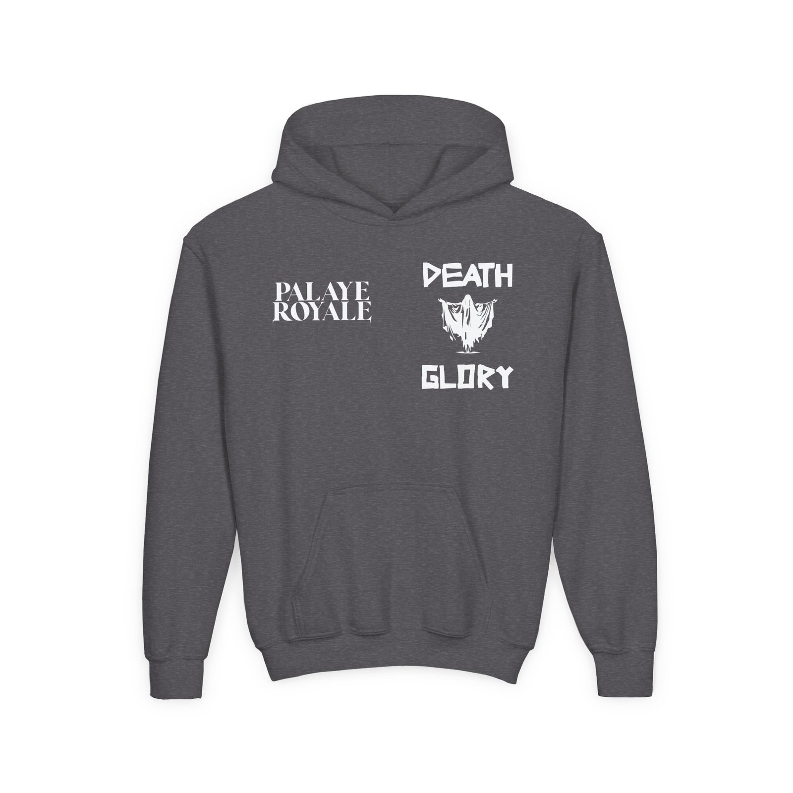 Soft, comfy, and a little bit mischievous — this youth Palaye Royale Death or Glory hoodie brings bright, playful energy to everyday wear. A drippy gradient smiley sits on the chest in neon orange-to-pink, framed by bold lettering that gives the design attitude without shouting. The midweight fabric holds its shape and keeps kids cozy through playground runs, chilly school mornings, and weekend hangouts. Thoughtful details like a roomy kangaroo pocket and twill neck tape make it durable and comfortable, while print and embroidery options let you add a custom touch. It’s the kind of hoodie that becomes a go-to for active days and casual adventures.