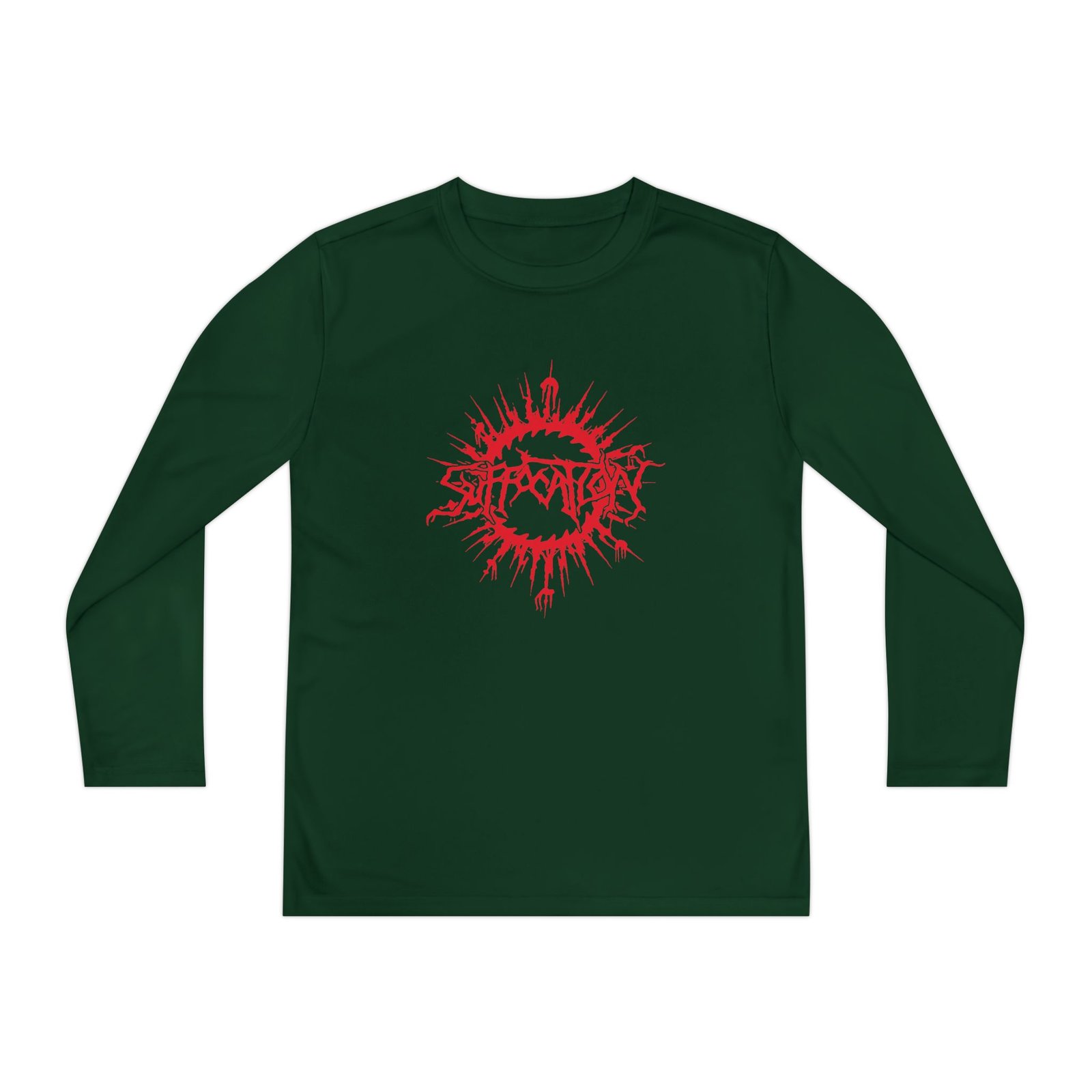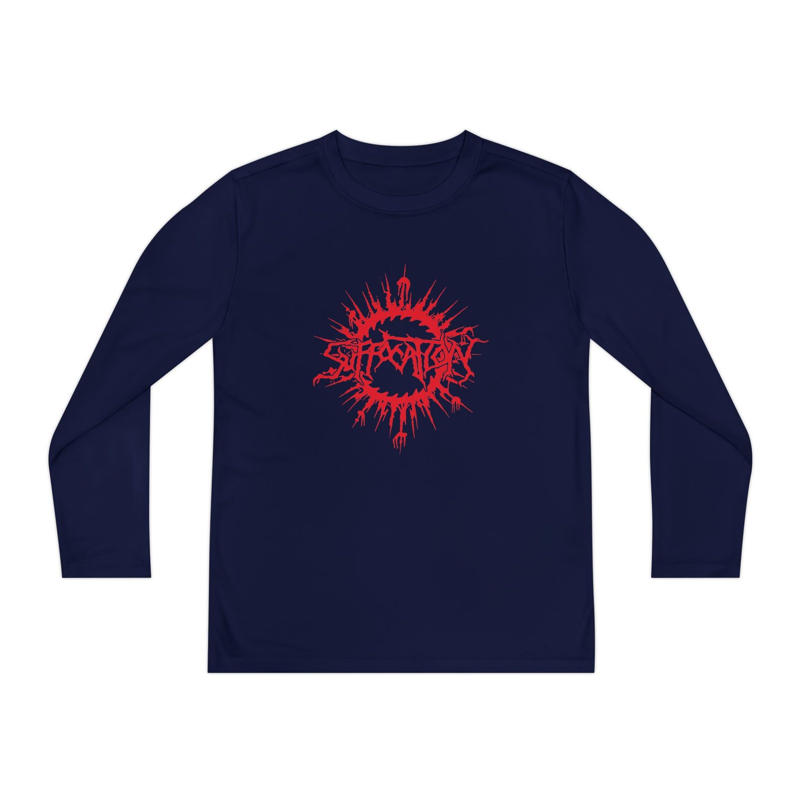 A lightweight Suffocation Blood Oath long-sleeve designed for active kids who lean into darker, atmospheric style. The shirt’s smooth, moisture-wicking polyester keeps movement unhindered and dries fast after practice or a day outside. The front art drops into a stormy, grayscale scene crowned by a jagged flash of lightning and moody gothic lettering — a bold, quietly rebellious statement that pairs with skate nights, band practice, or just hanging with friends. The athletic cut skims the body for an energetic silhouette, while the tear-away label keeps comfort high. Warmth is balanced with breathability, so it layers easily under a jacket or wears solo on cooler evenings.