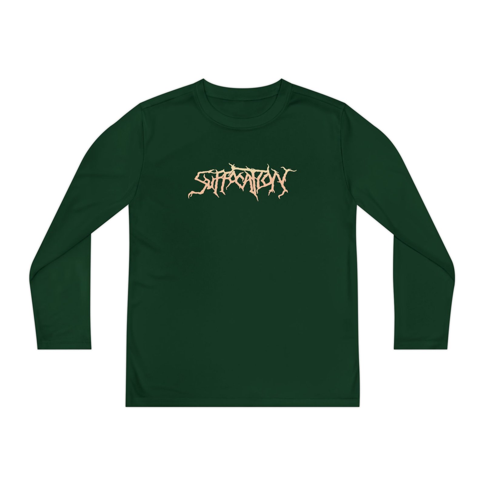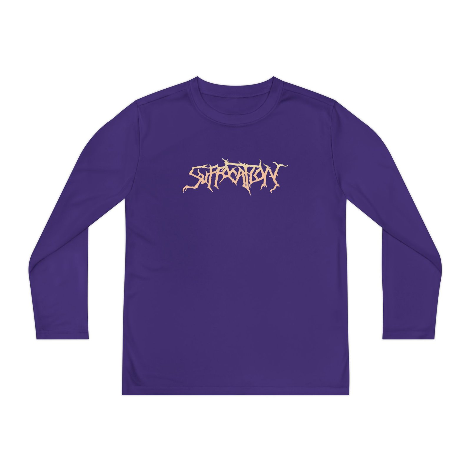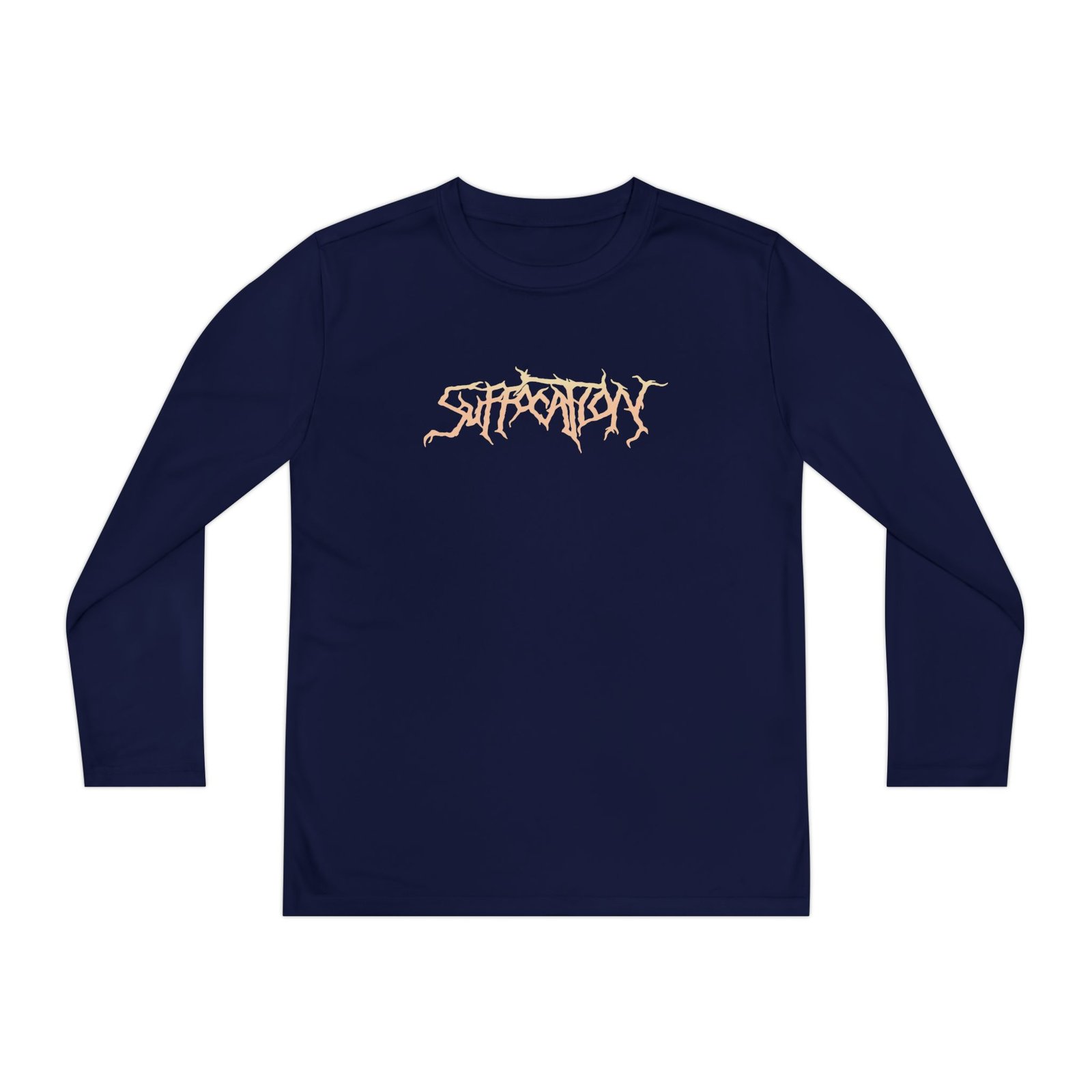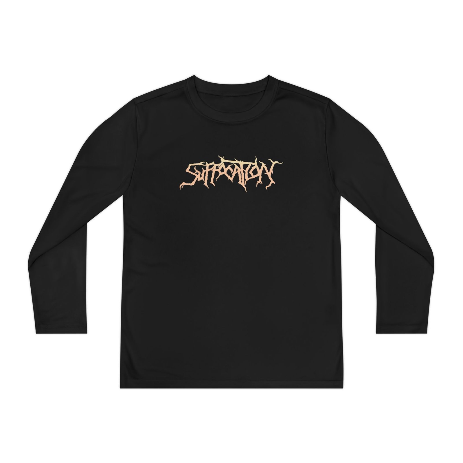 A lightweight Suffocation Hymns Logo long-sleeve designed for active kids who lean into darker, atmospheric style. The shirt’s smooth, moisture-wicking polyester keeps movement unhindered and dries fast after practice or a day outside. The front art drops into a stormy, grayscale scene crowned by a jagged flash of lightning and moody gothic lettering — a bold, quietly rebellious statement that pairs with skate nights, band practice, or just hanging with friends. The athletic cut skims the body for an energetic silhouette, while the tear-away label keeps comfort high. Warmth is balanced with breathability, so it layers easily under a jacket or wears solo on cooler evenings.