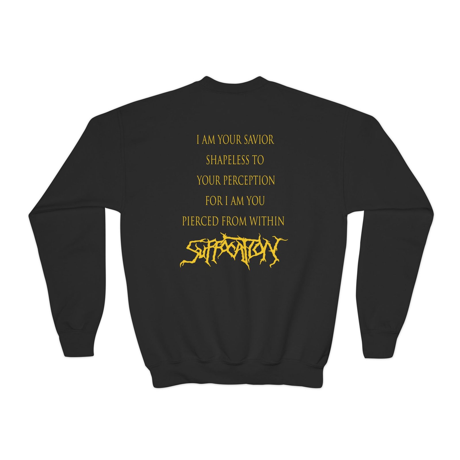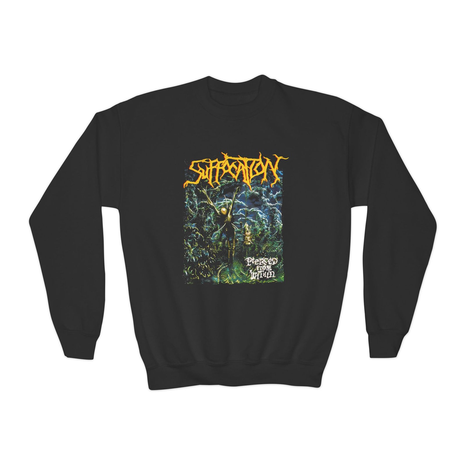 This loose-fit youth Suffocation Pierced From Within crewneck brings moody, occult-inspired style to everyday wear. A storm-lit silhouette and grainy, moonlit scene sit beneath hand-lettered gothic text in bruised purple — a look that reads like a midnight zine spread. The sweatshirt’s medium-heavy knit feels substantial without weighing down small frames, and the ribbed collar and cuffs hold their shape through play and repeat washes. Let this crew be the quiet centerpiece of a darker wardrobe: layered over band tees, hoodies, or under a denim jacket for a city-night vibe that leans mysterious and made-for-exploring.