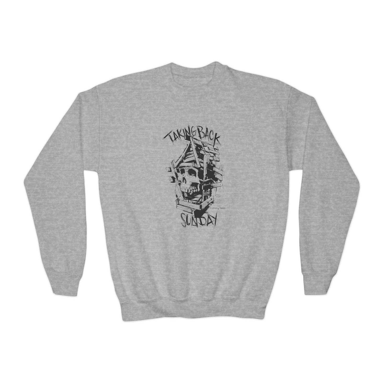 This loose-fit youth Taking Back Sunday Authentics Tattoo Raglan crewneck brings moody, occult-inspired style to everyday wear. A storm-lit silhouette and grainy, moonlit scene sit beneath hand-lettered gothic text in bruised purple — a look that reads like a midnight zine spread. The sweatshirt’s medium-heavy knit feels substantial without weighing down small frames, and the ribbed collar and cuffs hold their shape through play and repeat washes. Let this crew be the quiet centerpiece of a darker wardrobe: layered over band tees, hoodies, or under a denim jacket for a city-night vibe that leans mysterious and made-for-exploring.