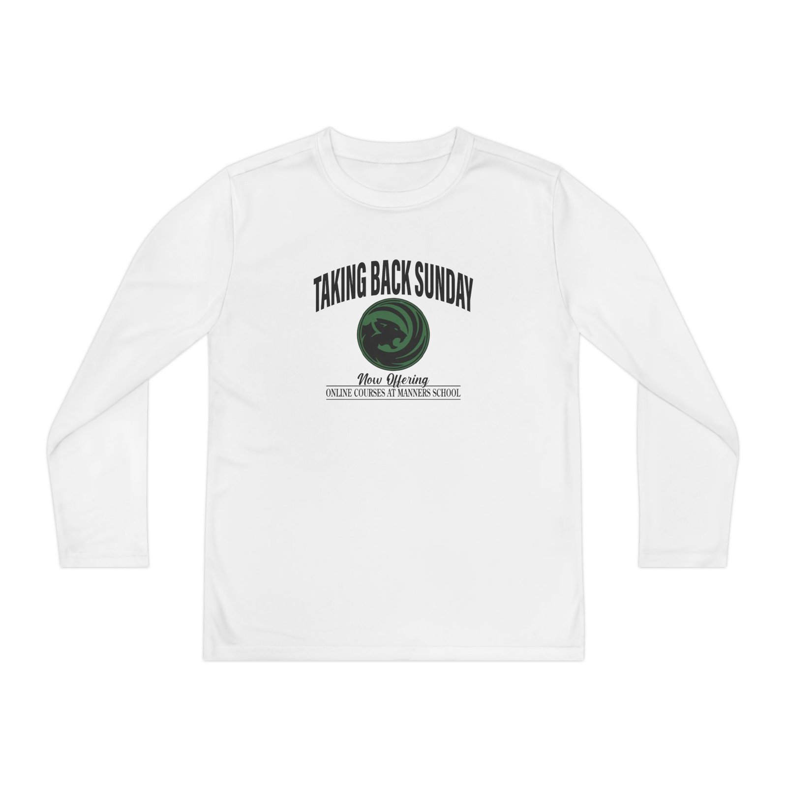 A lightweight Taking Back Sunday Manners School long-sleeve designed for active kids who lean into darker, atmospheric style. The shirt’s smooth, moisture-wicking polyester keeps movement unhindered and dries fast after practice or a day outside. The front art drops into a stormy, grayscale scene crowned by a jagged flash of lightning and moody gothic lettering — a bold, quietly rebellious statement that pairs with skate nights, band practice, or just hanging with friends. The athletic cut skims the body for an energetic silhouette, while the tear-away label keeps comfort high. Warmth is balanced with breathability, so it layers easily under a jacket or wears solo on cooler evenings.