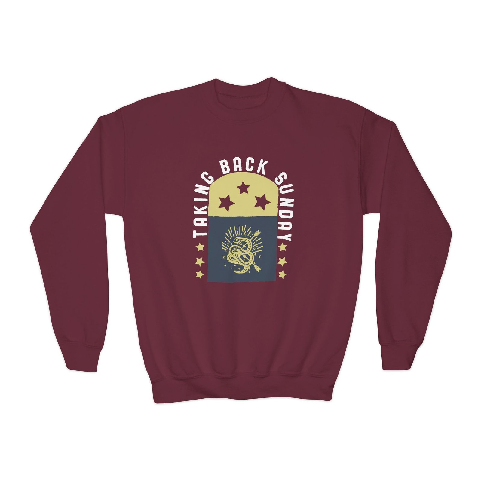 This loose-fit youth Taking Back Sunday Star Flag crewneck brings moody, occult-inspired style to everyday wear. A storm-lit silhouette and grainy, moonlit scene sit beneath hand-lettered gothic text in bruised purple — a look that reads like a midnight zine spread. The sweatshirt’s medium-heavy knit feels substantial without weighing down small frames, and the ribbed collar and cuffs hold their shape through play and repeat washes. Let this crew be the quiet centerpiece of a darker wardrobe: layered over band tees, hoodies, or under a denim jacket for a city-night vibe that leans mysterious and made-for-exploring.