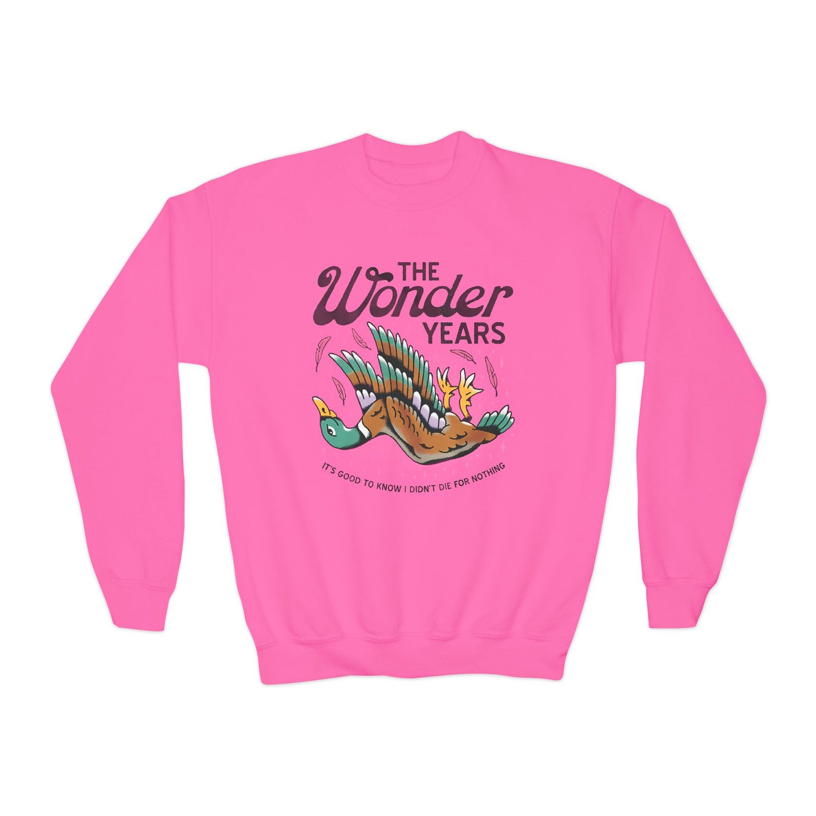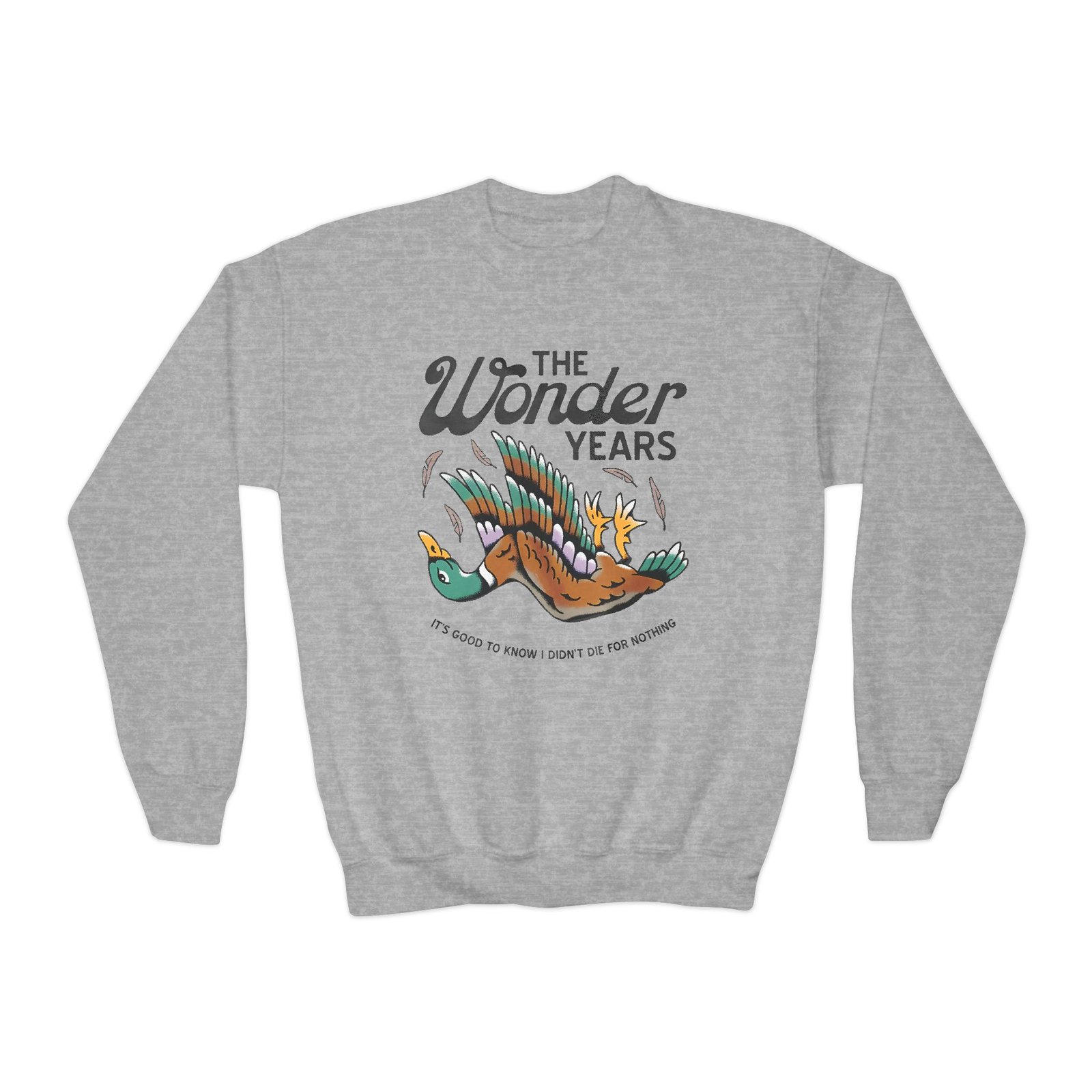 This loose-fit youth The Wonder Years Mallard crewneck brings moody, occult-inspired style to everyday wear. A storm-lit silhouette and grainy, moonlit scene sit beneath hand-lettered gothic text in bruised purple — a look that reads like a midnight zine spread. The sweatshirt’s medium-heavy knit feels substantial without weighing down small frames, and the ribbed collar and cuffs hold their shape through play and repeat washes. Let this crew be the quiet centerpiece of a darker wardrobe: layered over band tees, hoodies, or under a denim jacket for a city-night vibe that leans mysterious and made-for-exploring.