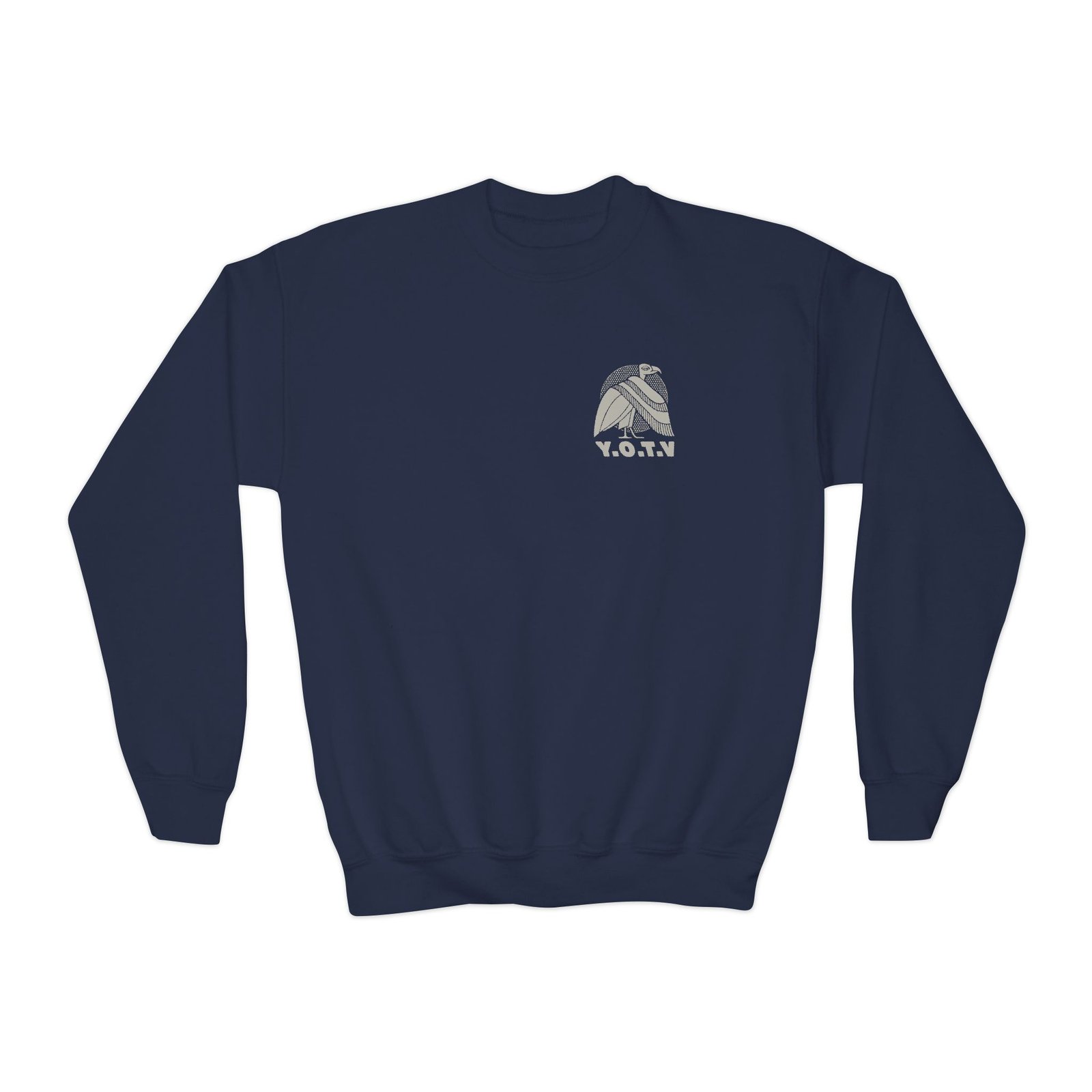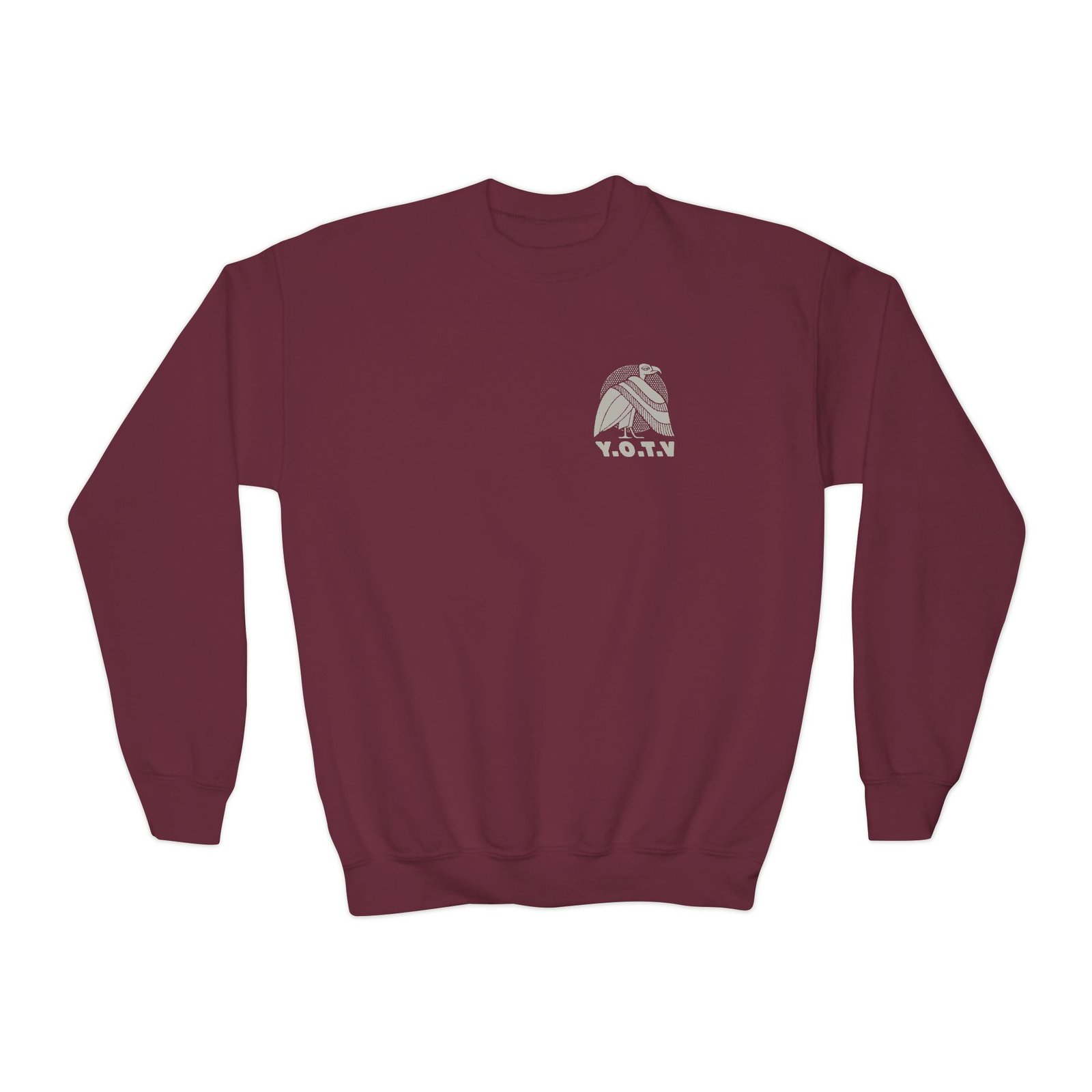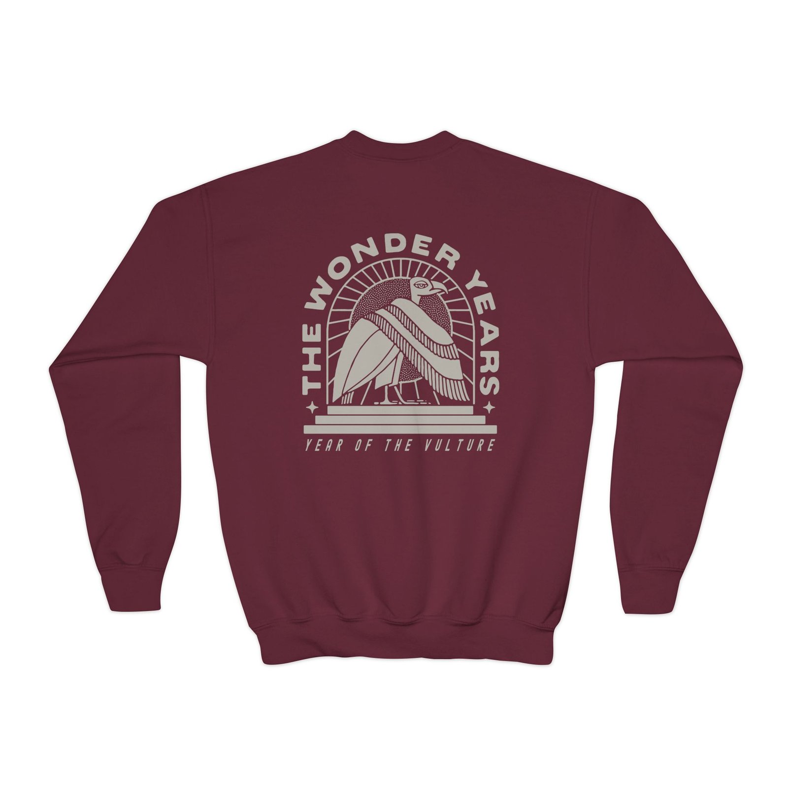 This loose-fit youth The Wonder Years of the Vulture crewneck brings moody, occult-inspired style to everyday wear. A storm-lit silhouette and grainy, moonlit scene sit beneath hand-lettered gothic text in bruised purple — a look that reads like a midnight zine spread. The sweatshirt’s medium-heavy knit feels substantial without weighing down small frames, and the ribbed collar and cuffs hold their shape through play and repeat washes. Let this crew be the quiet centerpiece of a darker wardrobe: layered over band tees, hoodies, or under a denim jacket for a city-night vibe that leans mysterious and made-for-exploring.