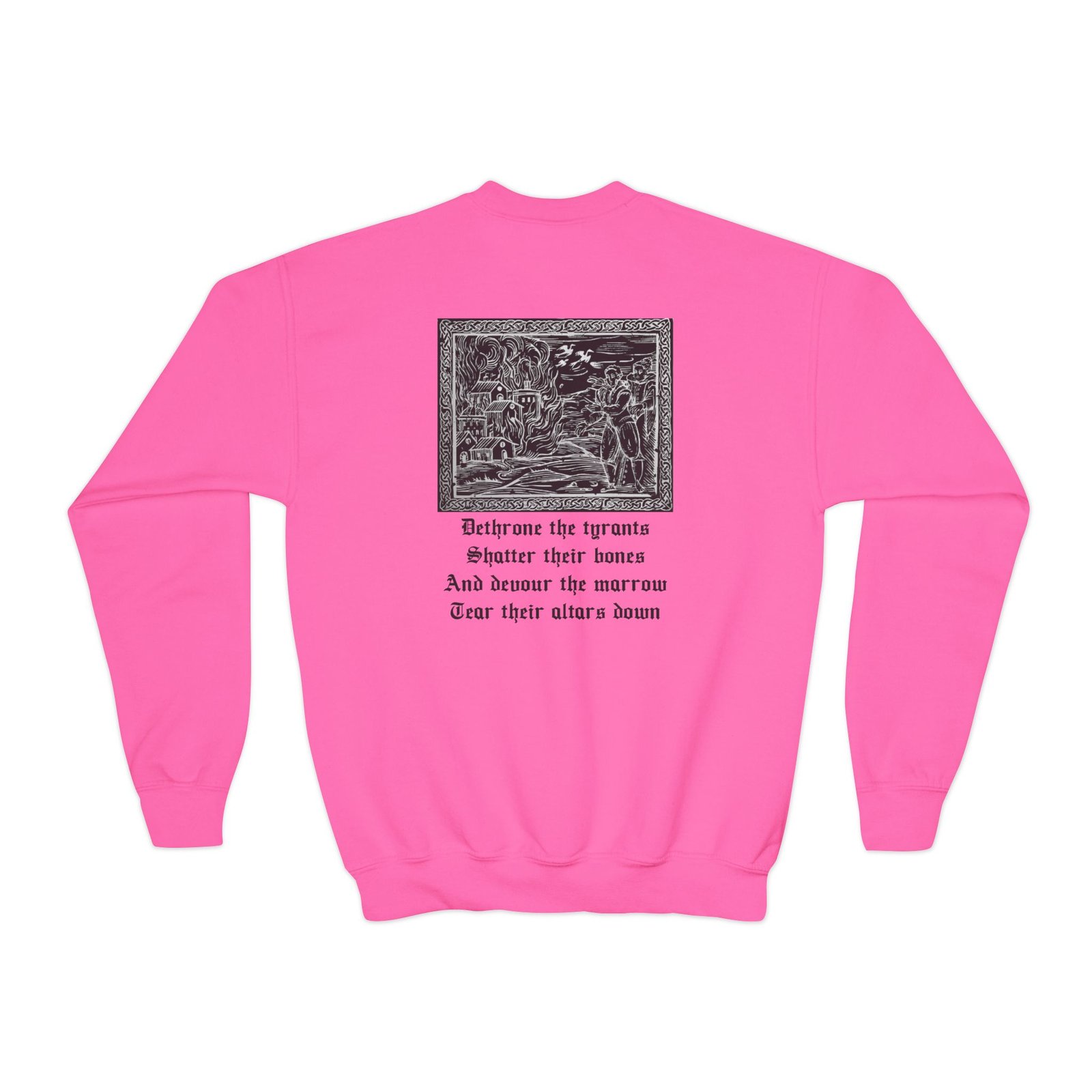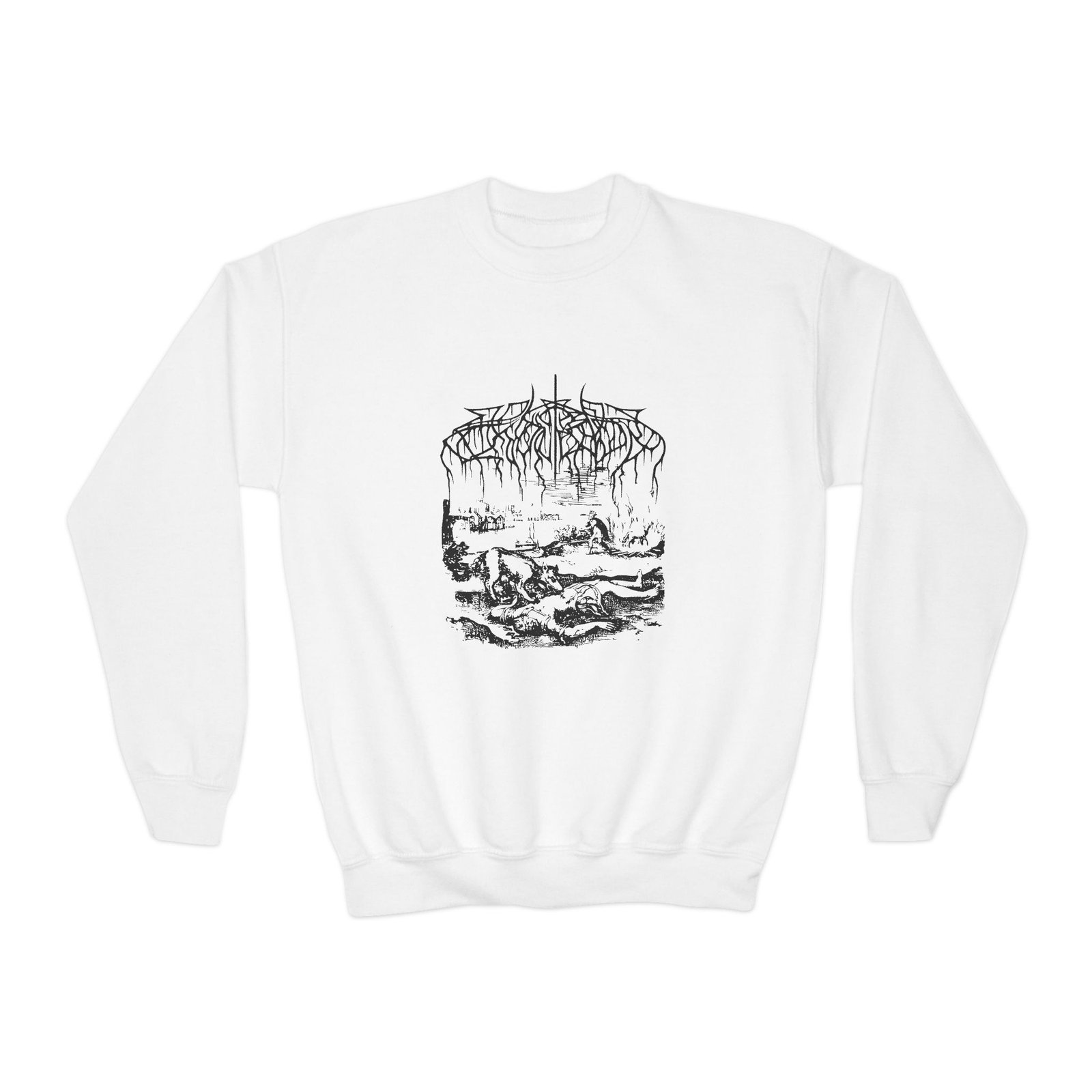 This loose-fit youth Wolves in the Throne Room Wolf Alchemy crewneck brings moody, occult-inspired style to everyday wear. A storm-lit silhouette and grainy, moonlit scene sit beneath hand-lettered gothic text in bruised purple — a look that reads like a midnight zine spread. The sweatshirt’s medium-heavy knit feels substantial without weighing down small frames, and the ribbed collar and cuffs hold their shape through play and repeat washes. Let this crew be the quiet centerpiece of a darker wardrobe: layered over band tees, hoodies, or under a denim jacket for a city-night vibe that leans mysterious and made-for-exploring.